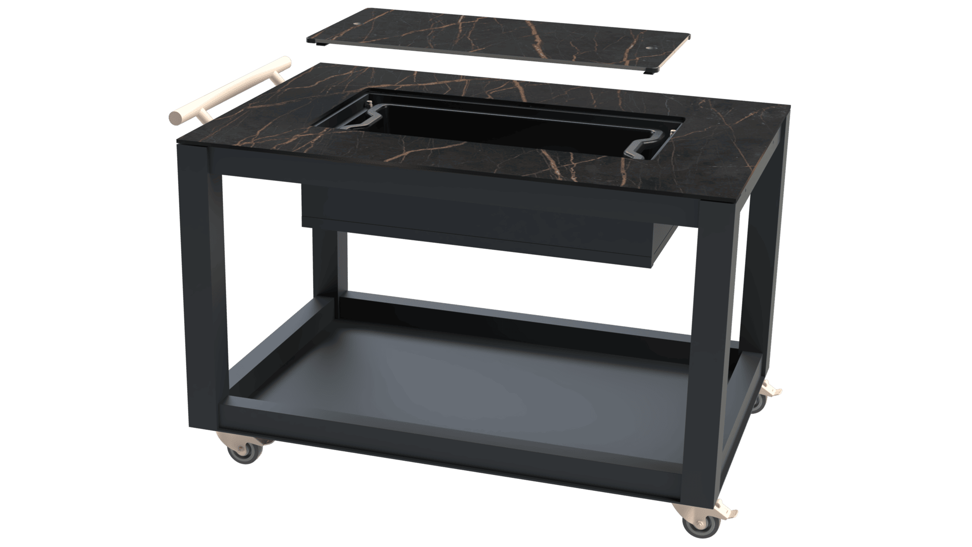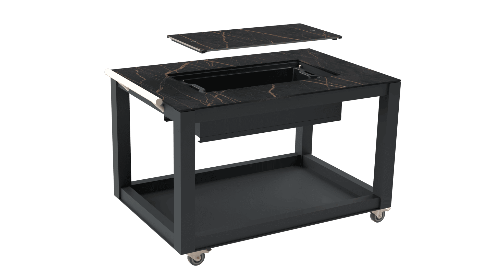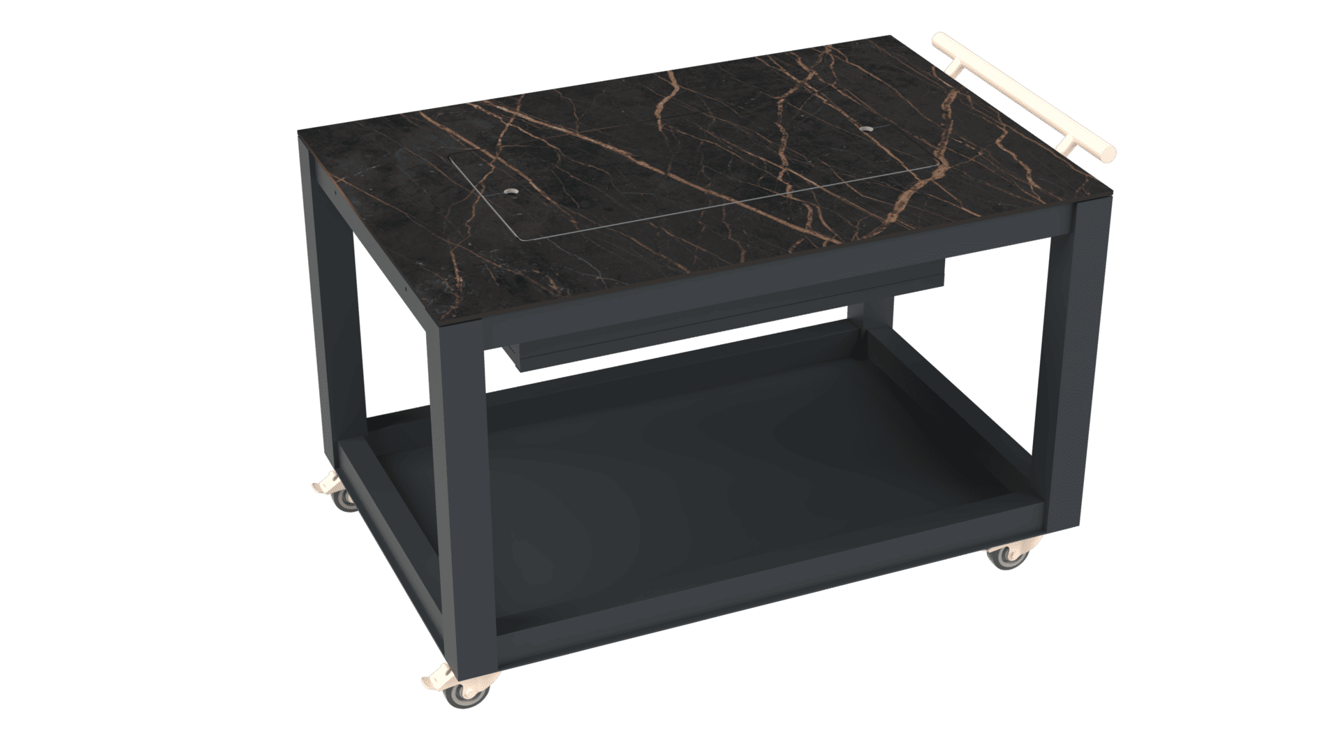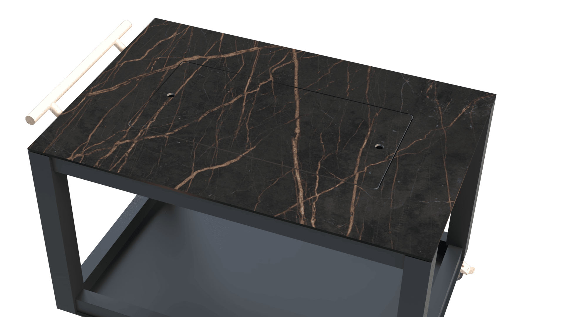 Servierwagen mit Vollgummirollen leichtgängig und Feststellbremse. Kühlbox integriert für die Kühlung der Getränke mit Eiswürfeln. Rahmen aus hochfestem Aluminium gefertigt und pulverbeschichtet. Tischplatte aus Keramik allwetterfest. Formschön und Pflegeleicht.